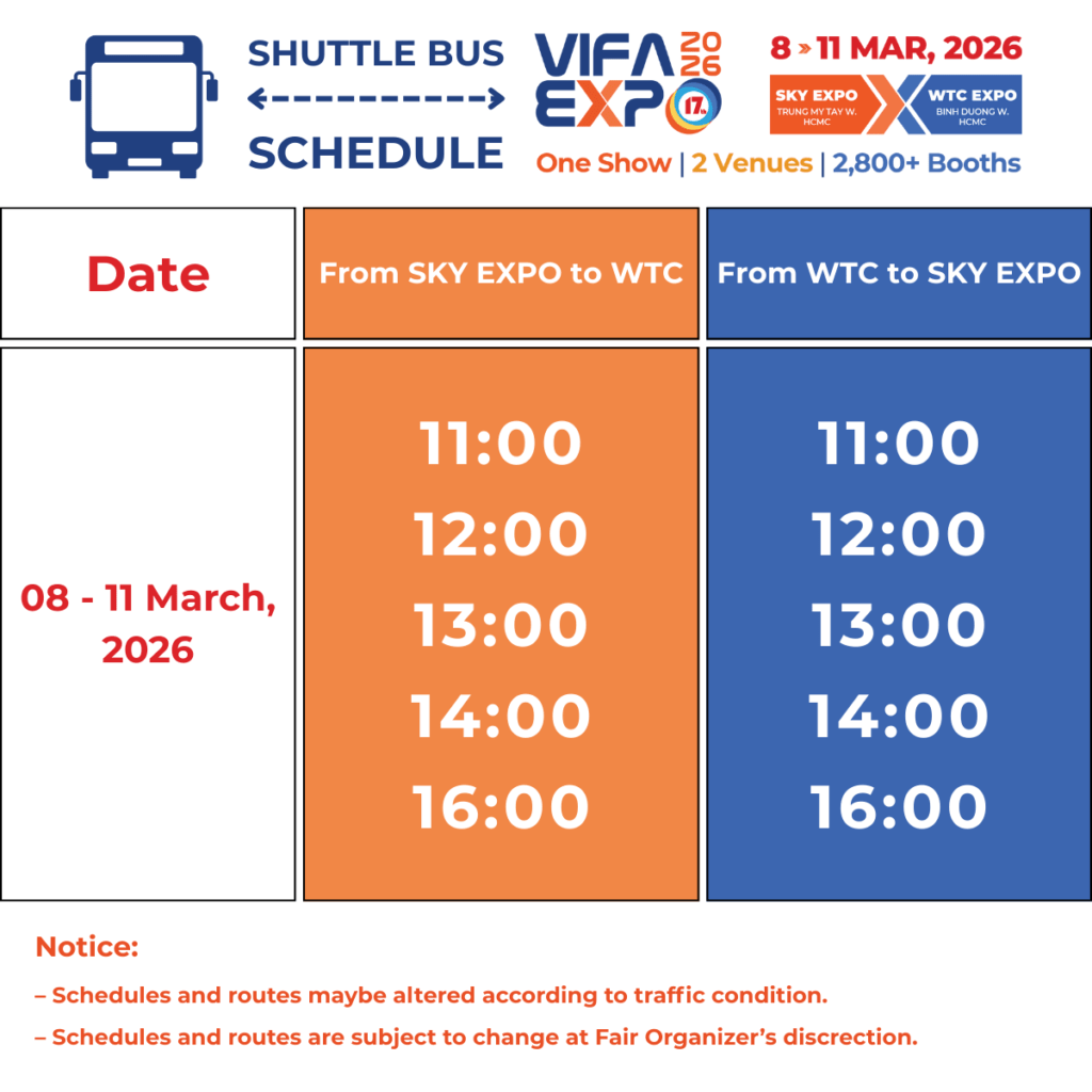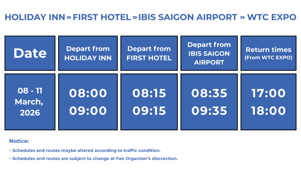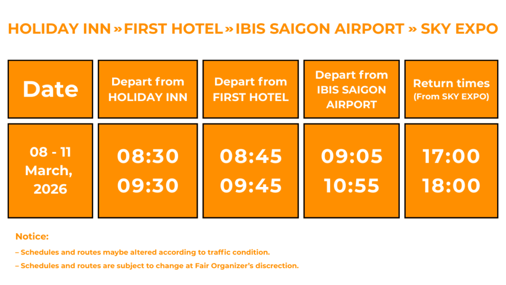 * The service is provided by Lien Minh Company for exhibitors & visitors who are planning to visit the industry exhibitions at SKY EXPO & WTC EXPO, Ho Chi Minh City. Please fill in this form for the shuttle bus registration.