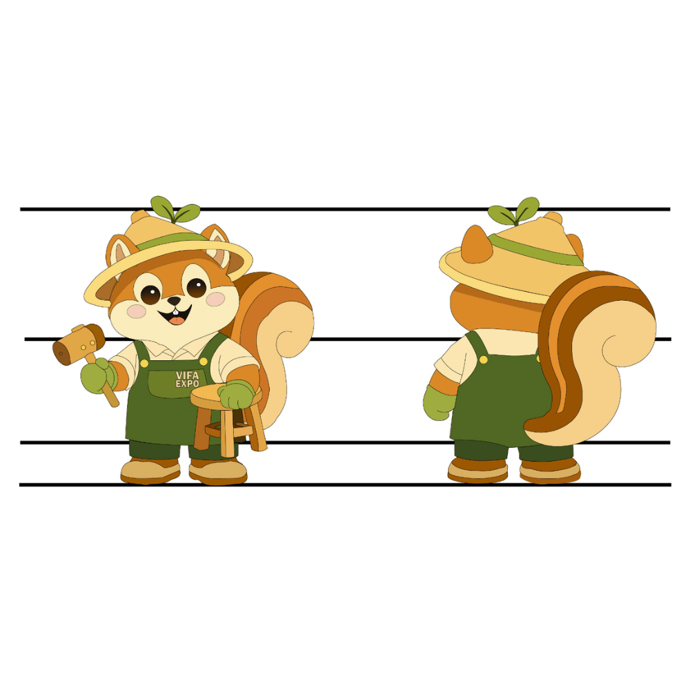 Phần đuôi sóc lớn, cong mềm phía sau không chỉ giúp nhân vật dễ nhận diện mà còn mang ý nghĩa chuyển động và cân bằng. Đó là hình ảnh của sự linh hoạt, thích nghi trước thay đổi của thị trường quốc tế, đồng thời giữ vững bản sắc nghề truyền thống Việt Nam. Dáng đứng chắc chắn của Mộc Túc thể hiện tinh thần vững vàng, đáng tin cậy – đúng với hình ảnh mà VIFA EXPO muốn truyền tải đến đối tác và khách tham quan.