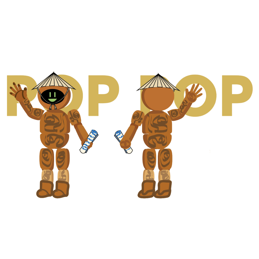 Về tạo hình tổng thể, “POP POP” được thiết kế với cấu trúc mô phỏng hình dáng con người, bao gồm đầu, thân, tay và chân với các khớp nối rõ ràng. Tuy nhiên, thay vì sử dụng các bề mặt kim loại thường thấy ở robot, toàn bộ cơ thể được thể hiện như được tạo nên từ gỗ. Các mảng hình khối trên cơ thể được xử lý theo hướng gợi nhắc đến những khối gỗ đã qua gia công, với các đường vân và chi tiết trang trí mang phong cách chạm khắc. Điều này giúp linh vật vừa mang dáng dấp của công nghệ, vừa giữ được bản sắc của ngành nghề thủ công. Cấu trúc khớp nối cũng góp phần tạo cảm giác linh hoạt, thể hiện khả năng chuyển động và thích nghi – những yếu tố quan trọng trong bối cảnh sản xuất và sáng tạo hiện đại.